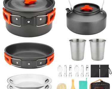 17pcs Camping Cookware Kit,Pot, 7inches Pan,Kettle Set with 2 Set Stainless Steel Cups Plates Forks Knives Spoons for Hiking